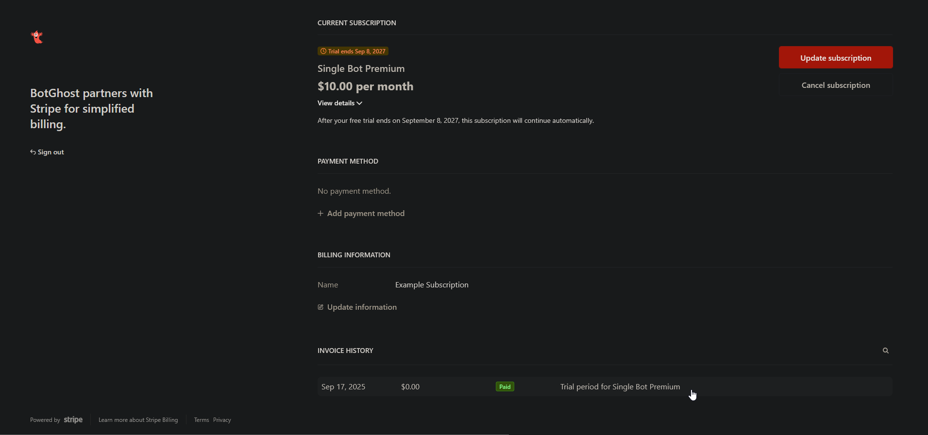 BotGhost uses 2 different subscription management portals depending on the type of subscription your purchased and when you purchased it.