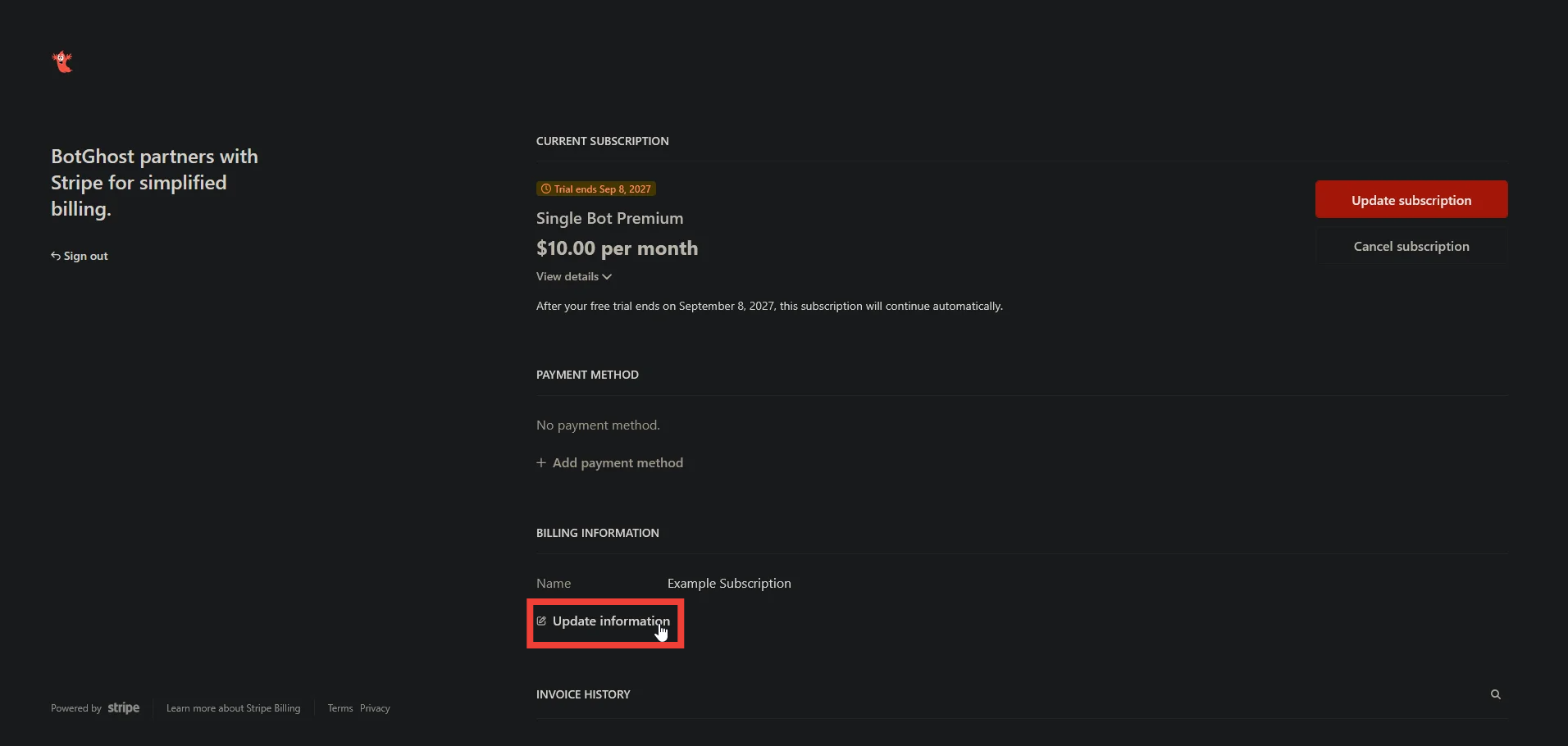2. Scroll down to the "Bot Subscription Options" and click on the Manage Subscription button to redirect to your self-serve subscription portal.