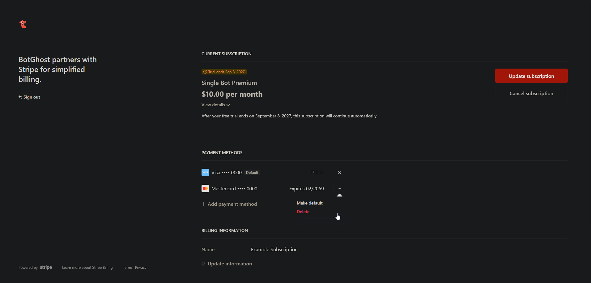 If you would like to update or remove a payment method for your BotGhost subscription, please follow the following steps:
