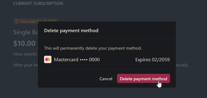 Deleting a payment method removes it from your subscription portal and it will no longer be used for billing.
