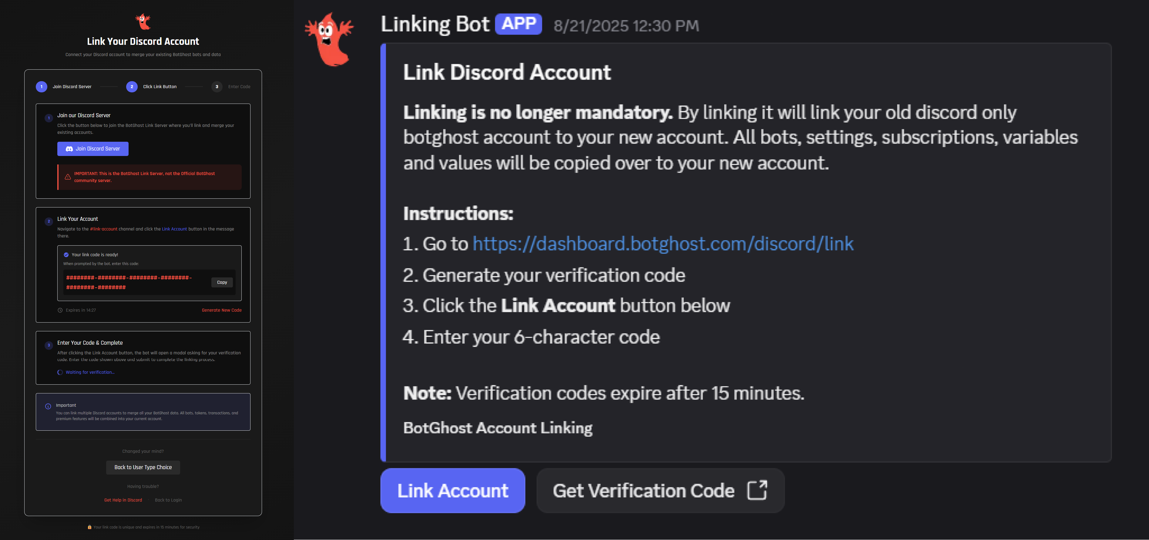 - Your BotGhost accounts are now linked, and you'll be able to see all your bots, settings, subscriptions and variables from your existing account!
