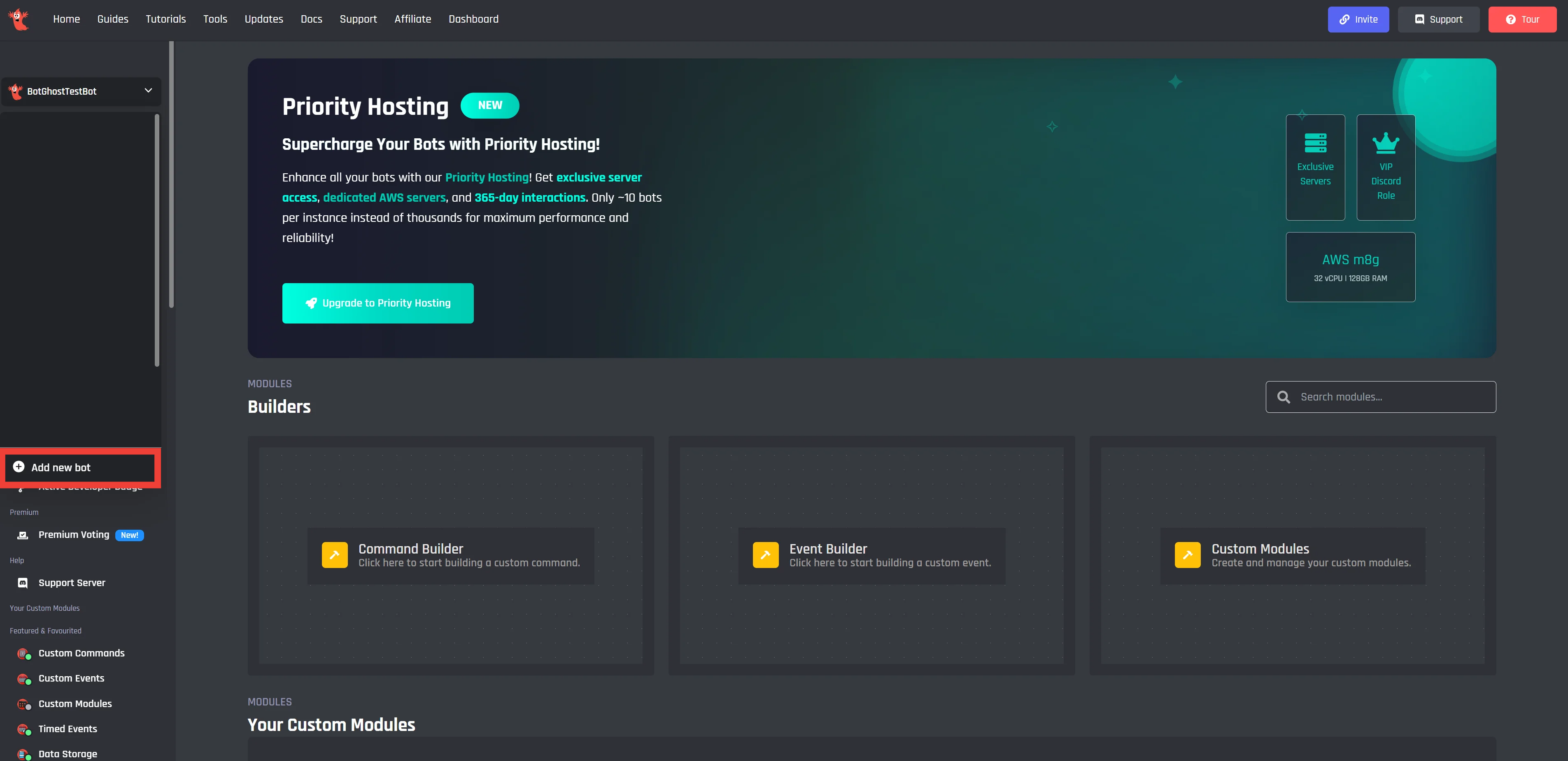 - Log into Account B's BotGhost Dashboard and click Add new bot.