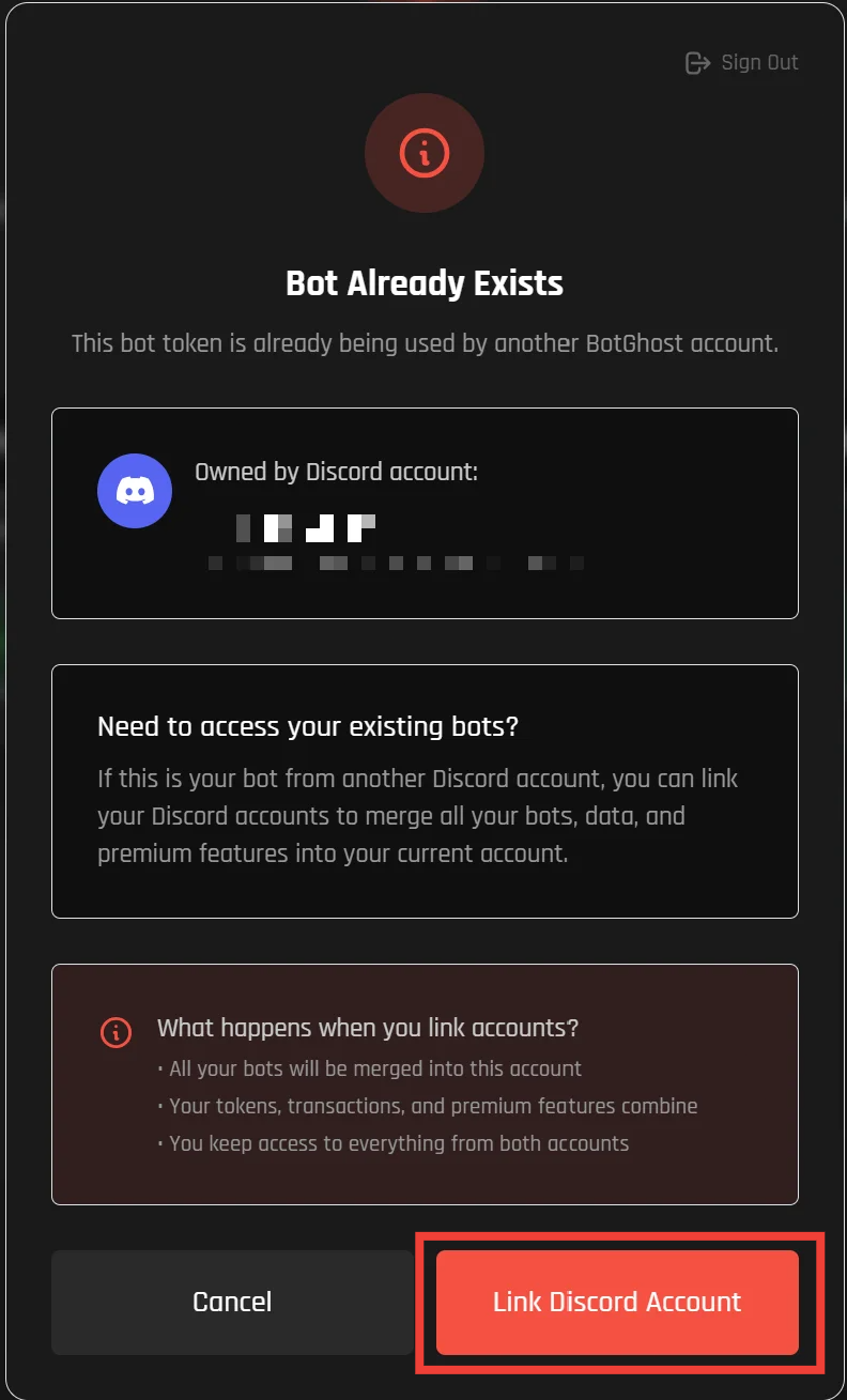 - Click Link Discord Account on the "Bot Already Exists" popup.