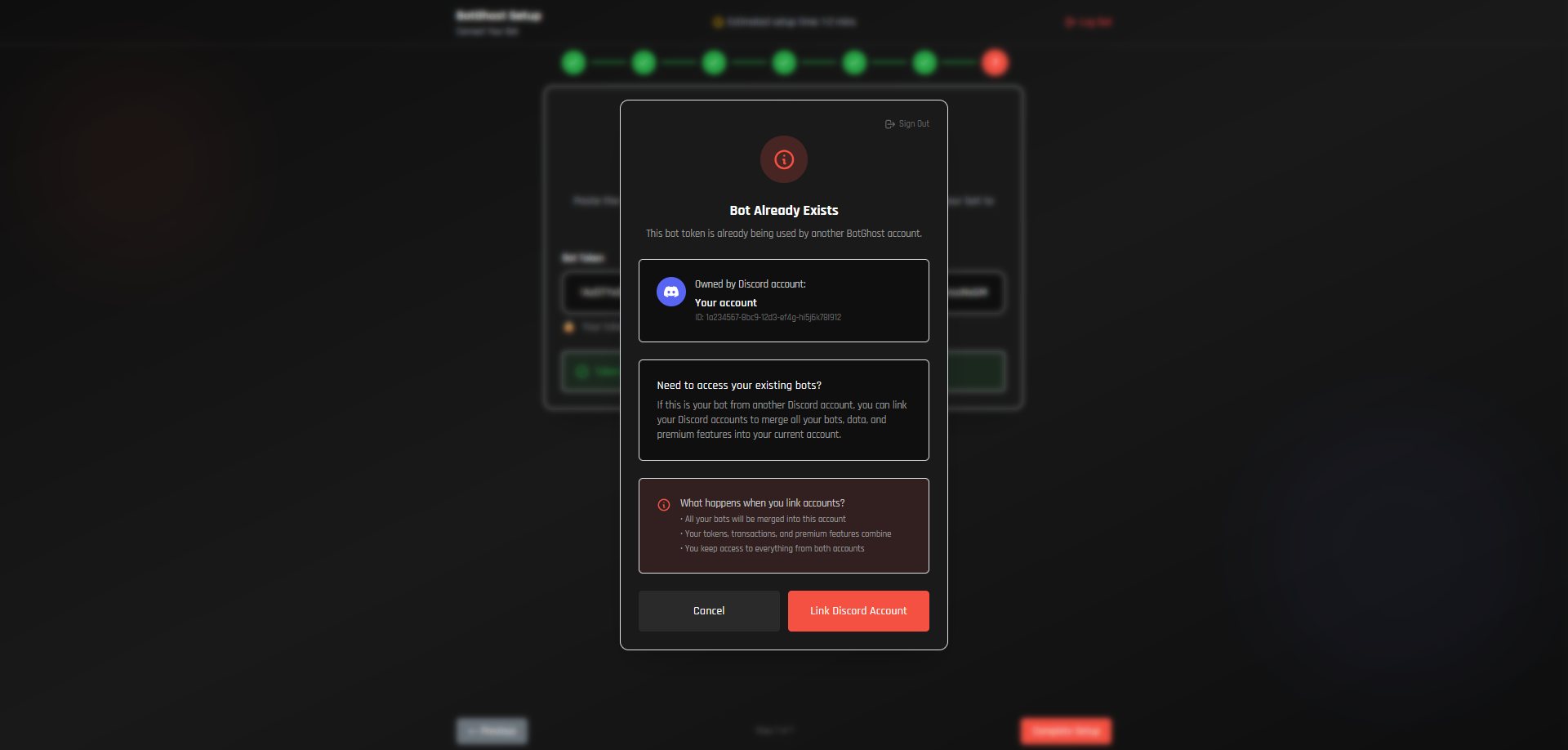 This error typically occurs when BotGhost detects that the bot you're trying to add or update is already registered to your account or another account. Follow the troubleshooting steps below to fix this error.